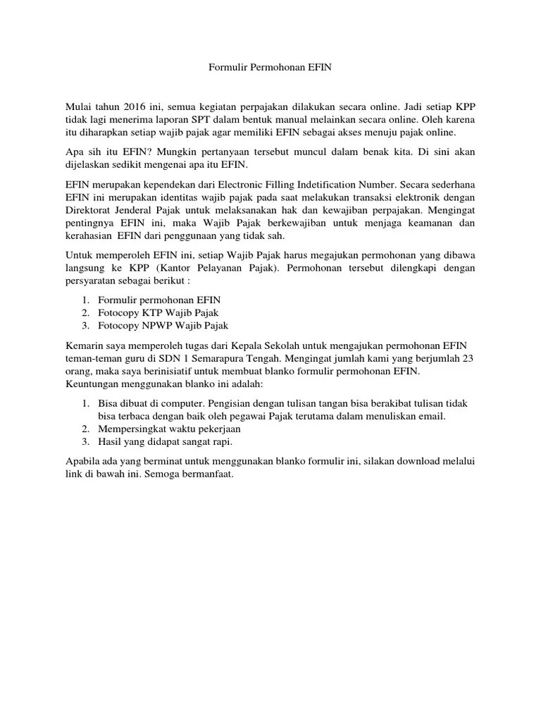 Dengan ini, saya mengajukan permohonan aktivasi efin dan mendaftarkan alamat. Subjek email 'permohonan efin', lalu lampirkan foto formulir permohonan efin dan swafoto anda yang memegang npwp dan ktp. (1) wajib pajak orang pribadi karyawan dapat mengajukan permohonan aktivasi efin secara berkelompok melalui pemberi kerja ke kpp atau kp2kp terdekat. Tentu saja, pengajuan efin secara daring akan lebih simple karena dapat . Wajib pajak menyampakan permohonan aktivasi efin melalui email dengan mengunduh formulir permohonan efin di . Kedua, isi formulir sesuai dengan identitas, . Pengertian efin pajak pribadi dan tata cara pengajuannya. Menunggu proses permohonan efin online · klik "daftar di sini" · masukkan nomor npwp, efin dan kode keamanan wp . Efin atau electronic filing identification . Atau mengajukan permohonan efin pajak pribadi secara online. Dalam rangka pelaksanaan hak dan kewajiban melalui layanan pajak online.